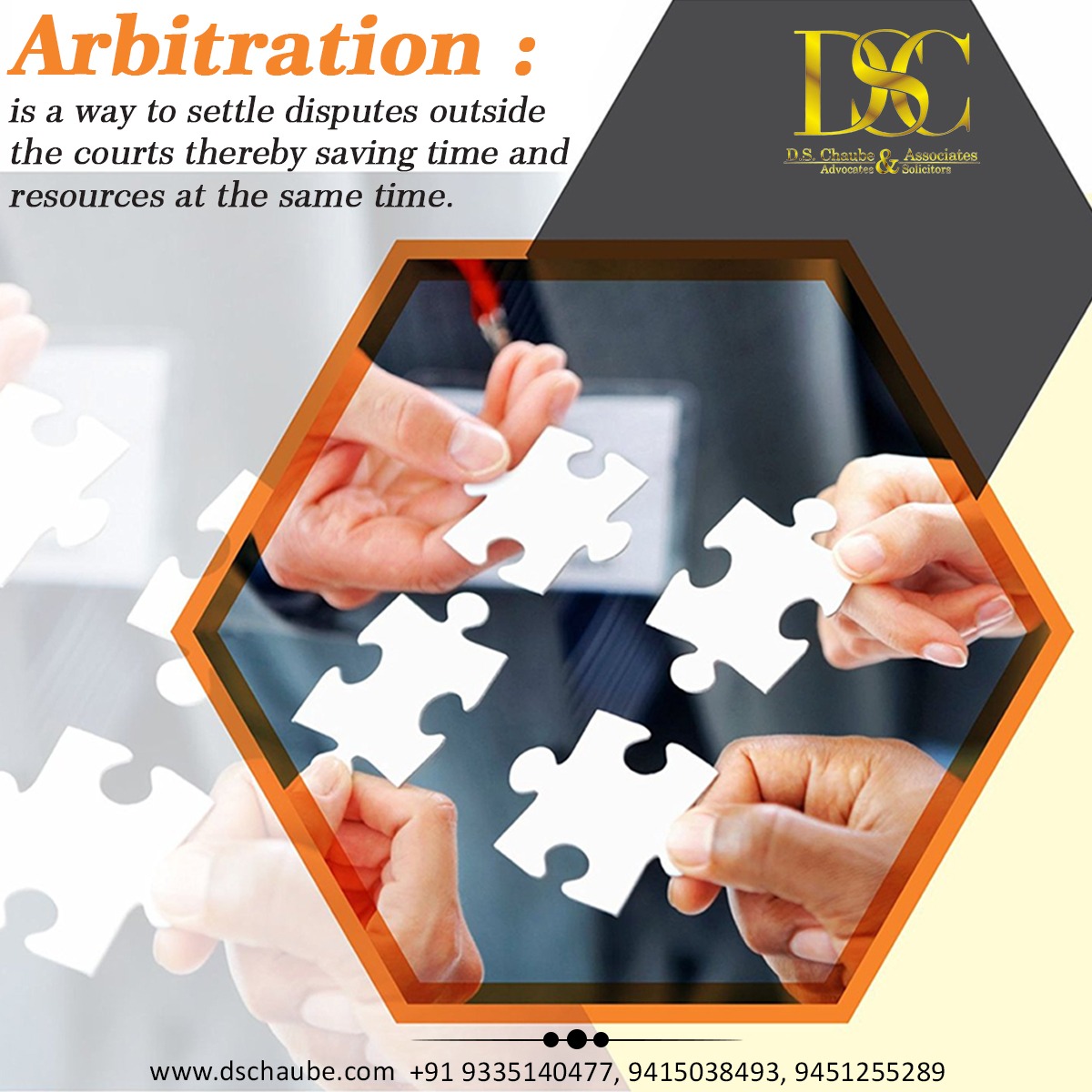 D.S.Chaube & Associates, Advocates, Attornies & Legal Consultants is a professionally managed and result oriented Indian legal firm that works on consistently providing professional, most accurate and efficient legal advice, support and assistance to organizations, companies, firms, business and financial enterprises, educational and charitable institutions, societies and individuals. We work round the clock to provide the finest legal service to our clients. Because of the guidance and experience provided by various Associates & Experts, we are able to quickly and efficiently advise on even the most complex legal issues and on any matter. Our law firm believes that the Indian Legal System is highly complex, yet there are some extremely simple solutions. Most of the Indian law firm fail to recognize this aspect of practice. Though some of the legal issues are extremely easy to solve and can be settle through negotiations, it seems some Attorneys, law firms and Legal Consultants have developed interest in prolonging and complicating the legal matters. D.S. Chaube & Associates believes in power of explanation and transparency in tackling legal matters.